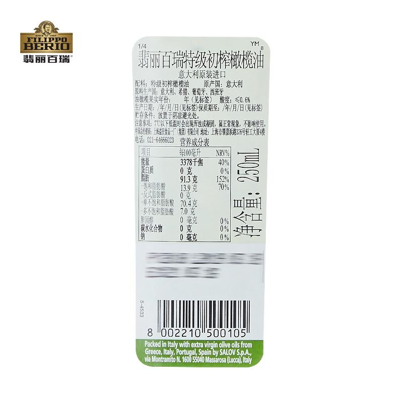 翡丽百瑞 意大利原装进口 特级初榨橄榄油 250ml/瓶