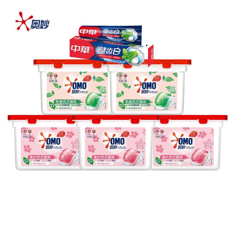 奥妙 除菌除螨柔衣护衣増香洗衣凝珠5盒装共250颗促销装洗衣液,赠送一支中华牙膏200g
